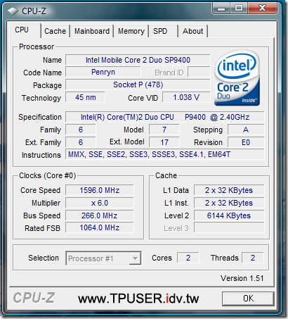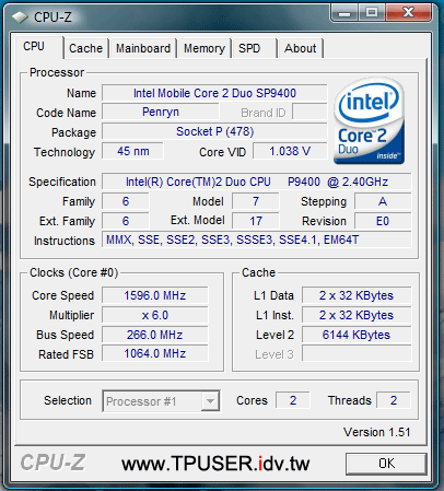 ▼下圖是站長借測的ThinkPad T400s CPU資訊,採用Intel Core 2 Duo SP9400(2.4GHz)。T400s規格上最高可採用SP9600(2.53GHz)的CPU,只是T400s的CPU是銲死在主機板上的,因此使用者無法像T400一樣自行升級CPU。