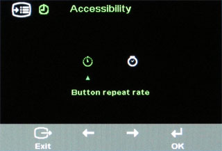 定址(Accessibility)選項又提供兩項次功能;按鈕連打速率(Button repeat rate)及選單顯示時間(Menu time out)。下面五張圖是各功能擷圖。