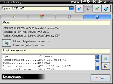 L220x除了可由螢幕本身的按鈕進行調整,隨機也附上一套「OnScreen Manager」軟體,使用者可在視窗環境中調整各項設定,該軟體可管理多台ThinkVision螢幕。