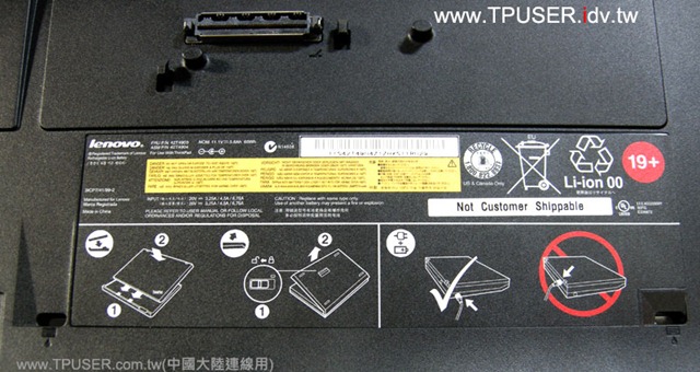 ▼當使用X220底部擴充電池時,因為會占用到底座接頭,因此無法再接取Ultrabase或其他Dock。請參閱下圖中的電池貼紙,右側有特別提到當主機與擴充電池連接時,「不要」將變壓器接頭插到主機上!必須插在電池上面。在下圖中也能夠看到電池兩側還設計了兩個「排水孔」,以配合主機本身的排水孔位置。