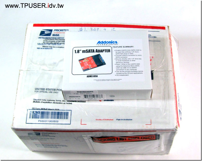 ▼經過約一個月終於收到從美國寄來的國際包裹,雖然美國郵局的紙箱很大,但其實1.8" mSATA Adapter的紙盒非常小。