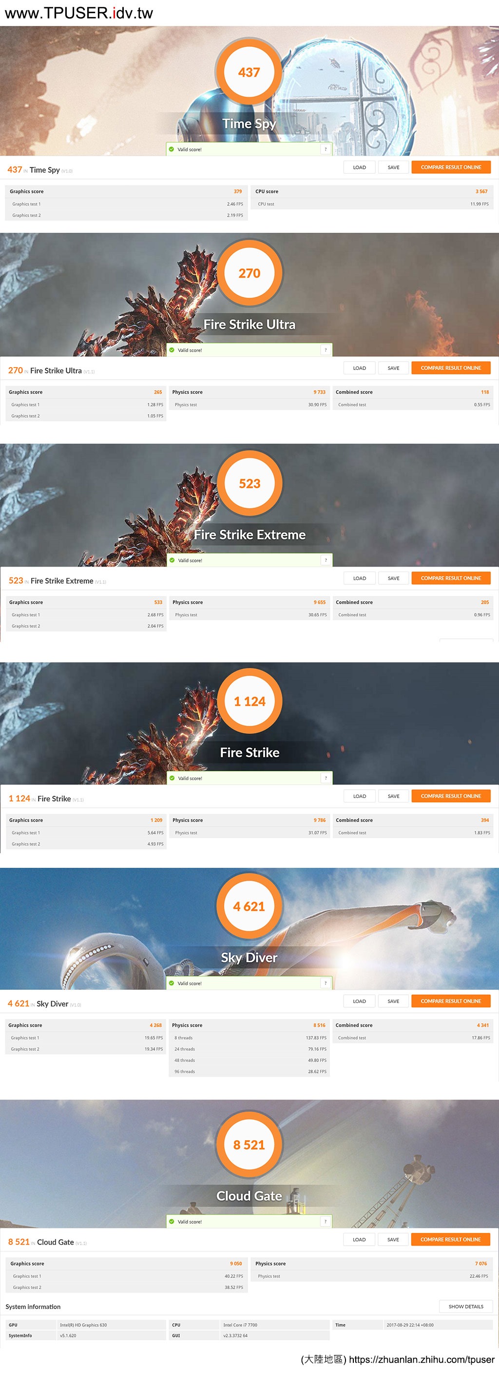 ▼接下來是P320 Tiny的3DMark成績。站長借測的P320 Tiny預載了單條16GB DDR4-2133記憶體,原本已經跑完相關的測試項目了,但卻始終無法順暢撥放4K@60fps影片,在更換撥放軟體、解碼codec都無效之後,站長想起了系統的記憶體是以「單通道」模式運行。後來乾脆換上手邊的兩條8GB DDR4-2133記憶體跑「雙通道」模式,果然撥放流暢度有明顯的改善。即使記憶體被迫降速為DDR4-2133,但拜雙通道之賜,效能還是勝過單條DDR4-2400。所以站長後來把所有的項目均以雙通道模式全部重測,果然成績都進步不少。特別是當系統僅有內顯時,記憶體的頻寬大小的確會影響整體效能。換句話說,如果P320 Tiny是安裝兩條8GB DDR4-2400記憶體時,相信成績會比站長所測得的又更好一些。