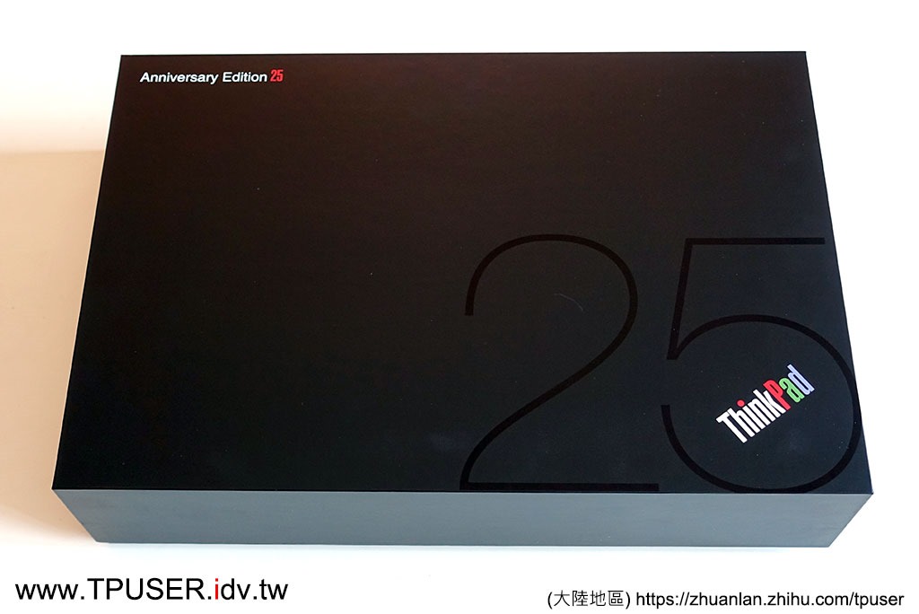 ▼打開瓦楞紙箱後,裡面還有一個黑色的紙盒,主機與配件都放在這個精美設計過的黑色紙盒內。為配合ThinkPad二十五週年紀念,今年的活動Logo如果有提到「ThinkPad」會特別將「Pad」三個字分別塗上紅色、綠色與藍色。此項設計是向IBM時代的ThinkPad Logo致敬,當時的「IBM」字樣便是彩色的。為何要選這三種顏色呢?因為史上第一台ThinkPad,700C推出時便首度搭載了「彩色」的LCD螢幕,這在仍為黑白螢幕當道的年代,可謂突破性的創新。因此在ThinkPad外殼上的IBM字樣就分別塗上象徵「RGB三原色」的紅色、綠色與藍色。紙盒上也比照外箱,寫著大大的「25」字樣,同時也揭露了「ThinkPad 25」正式型號,
