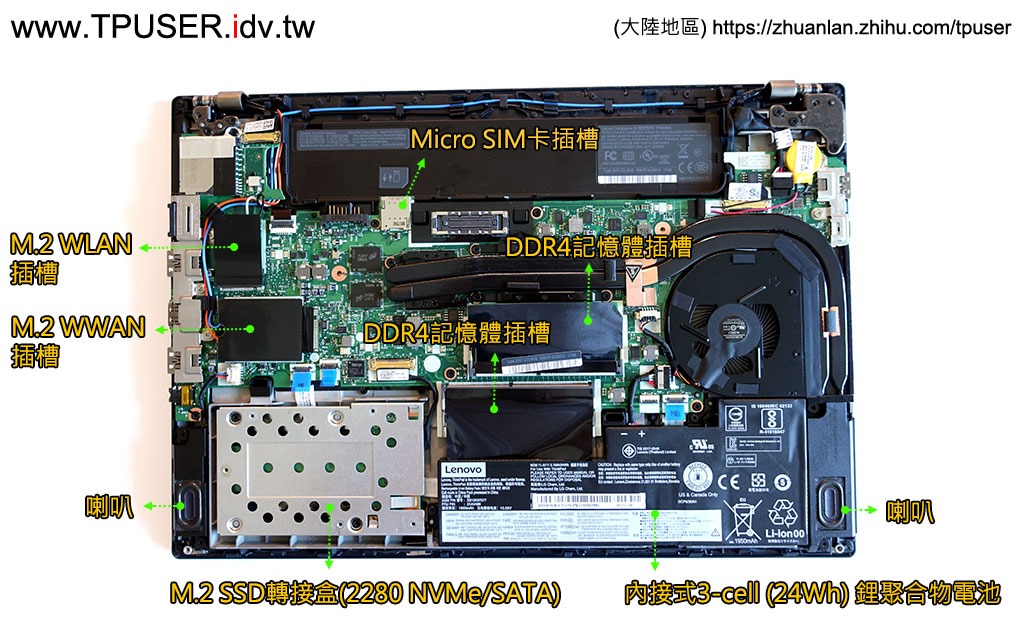 ▼下圖是TP 25打開底殼後的內部構造特寫,站長已經把重要元件的位置都標示出來。站長覺得T470架構的最大遺憾是沒有足夠的空間放置2280長度的M.2 SSD,導致T470以及TP 25的M.2 SSD必須跟2.5吋SSD/HDD共用相同的位置,無法達成單條2280長度的M.2 SSD同時搭配2.5吋SSD或是傳統硬碟。雖然可以將WWAN(4G/LTE網卡)用的M.2插槽拿來安裝2242長度的M.2 SSD,但畢竟需要犧牲掉WWAN上網功能。