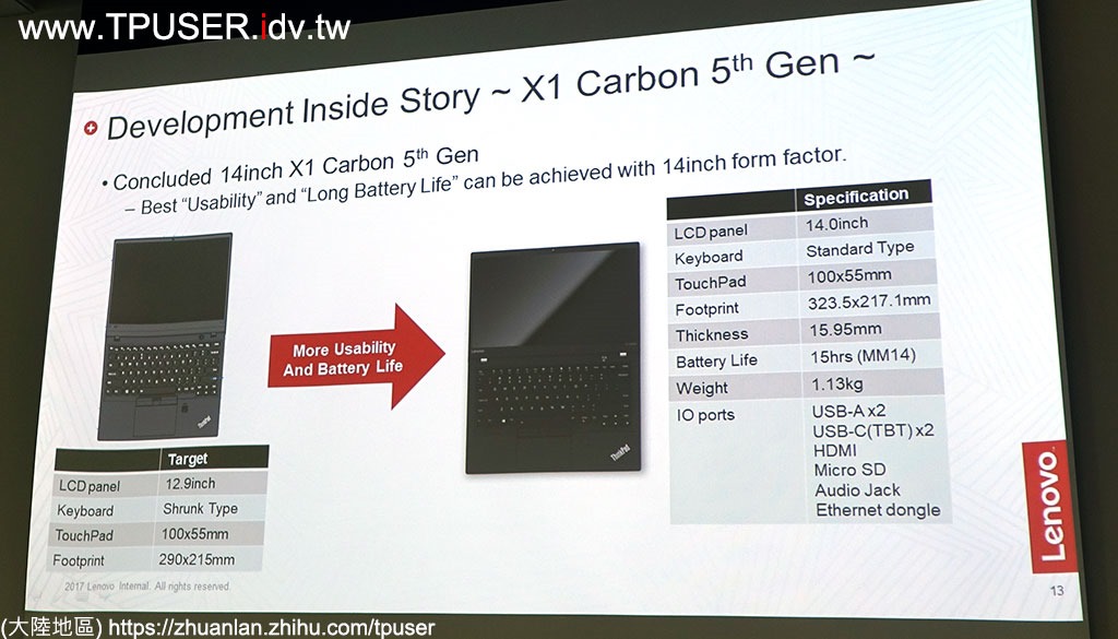 如果拿今年推出的新一代X280做個比較,當X280使用碳纖維背蓋時,主機起始重量為1.13公斤,主機厚度介於17.4mm至17.8mm之間,所以X280在重量與厚度上,其實已經達成當年的規格設定目標。