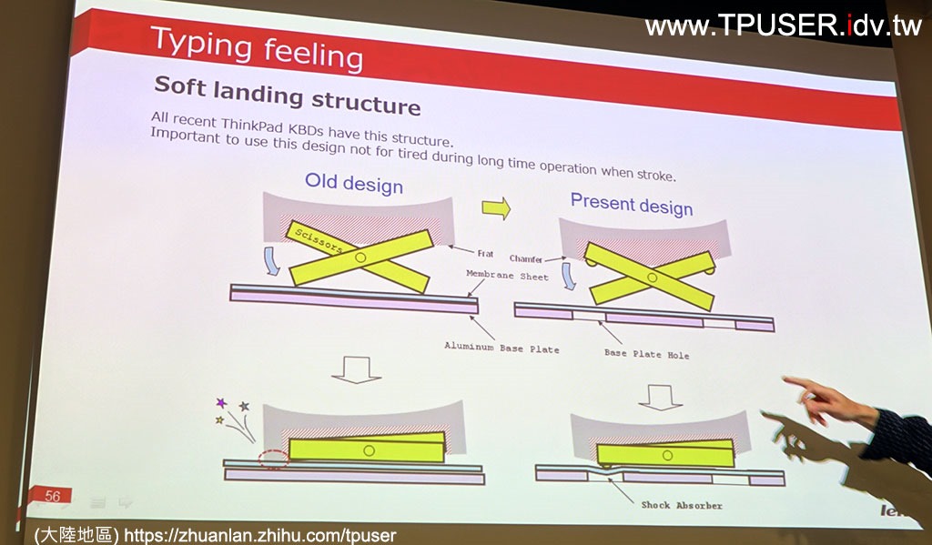 ▼下面這張簡報更清楚地呈現出,新一代七列鍵盤的鍵帽側面特寫,為了支援軟著陸架構而有新的設計。因此ThinkPad 25的七列鍵盤是全新開模,加上僅在少數國家或地區販售,導致研發、開模、生產的成本無法靠量產壓低,而且僅供ThinkPad 25一台使用,真的是「傳說等級」的超稀有夢幻鍵盤了。