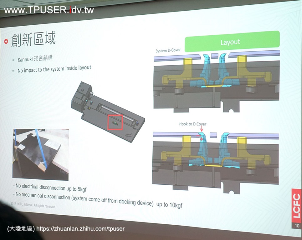 ▼為了避免ThinkPad連上底座時,被使用者不慎硬拔起來,原廠在CS18世代的底座加入了「閂(Kannuki)」崁合結構,在不影響主機底部內側的零件排列下,可將底座鎖住主機的底殼(D-Cover),並且承受一定的拉拔施力。