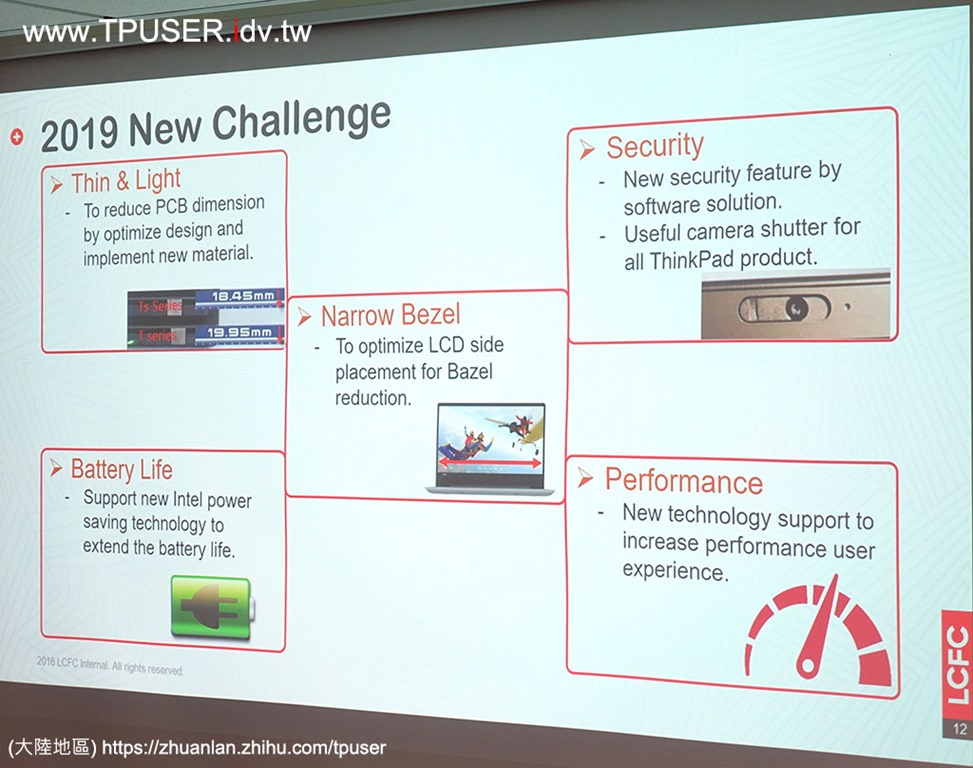 ▼吳先生負責主講的簡報「ThinkPad System Design Concept」中,最後特別提到了設計ThinkPad 2019年款的新挑戰,首先是T系列的持續輕薄化。簡報左上角秀出的是T480與T480s的機身厚度,展望2019年,新年度的T系列似乎有機會,藉由電路板的最佳化設計以縮小尺寸,並應用新的材質,進一步達成T系列更輕薄化的目標。至於現在最流行的窄邊框設計,明年也有可能適用於各系列,但相對的可能須付出無線網路訊號較弱的代價,如果天線不再擺放在螢幕上方,而改成螢幕下方或是主機內時。