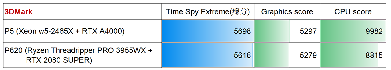 ▼接著是針對Direct X 11 API而設計的「Fire Strike Ultra」測試項目,同樣將場景解析度提高到4K(3840 x 2160),P5整體效能比P620高一些。之前測過的P1 Gen4(Core i7-11850H+ RTX-3070)總分為5543,總算讓站長覺得買桌上型工作站有其效能優勢了(笑)。