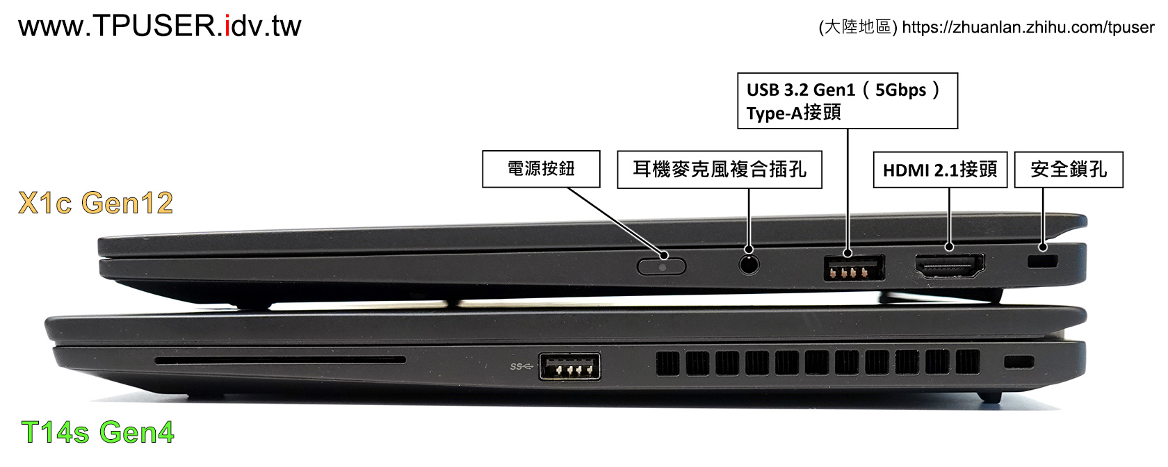 ▼下圖是X1c Gen12的左側特寫,站長也特別拿出同為14吋(16:10)面板的T14s Gen4(AMD)做個對比。X1c Gen12雖然比起T系列小了一號,仍維持了豐富的連接埠設計。機身左側提供兩個USB-C接頭(同時擔任充電用途),以及一個USB-A接頭。要留意的是,X1c Gen12如果有內建WWAN天線,機身左側會提供Nano SIM卡的插槽,站長購買的是內建5G WWAN網卡版本,因此有提供實體SIM卡的插槽,但使用者也可以使用非實體的eSIM卡,搭配內建WWAN網卡進行無線上網。