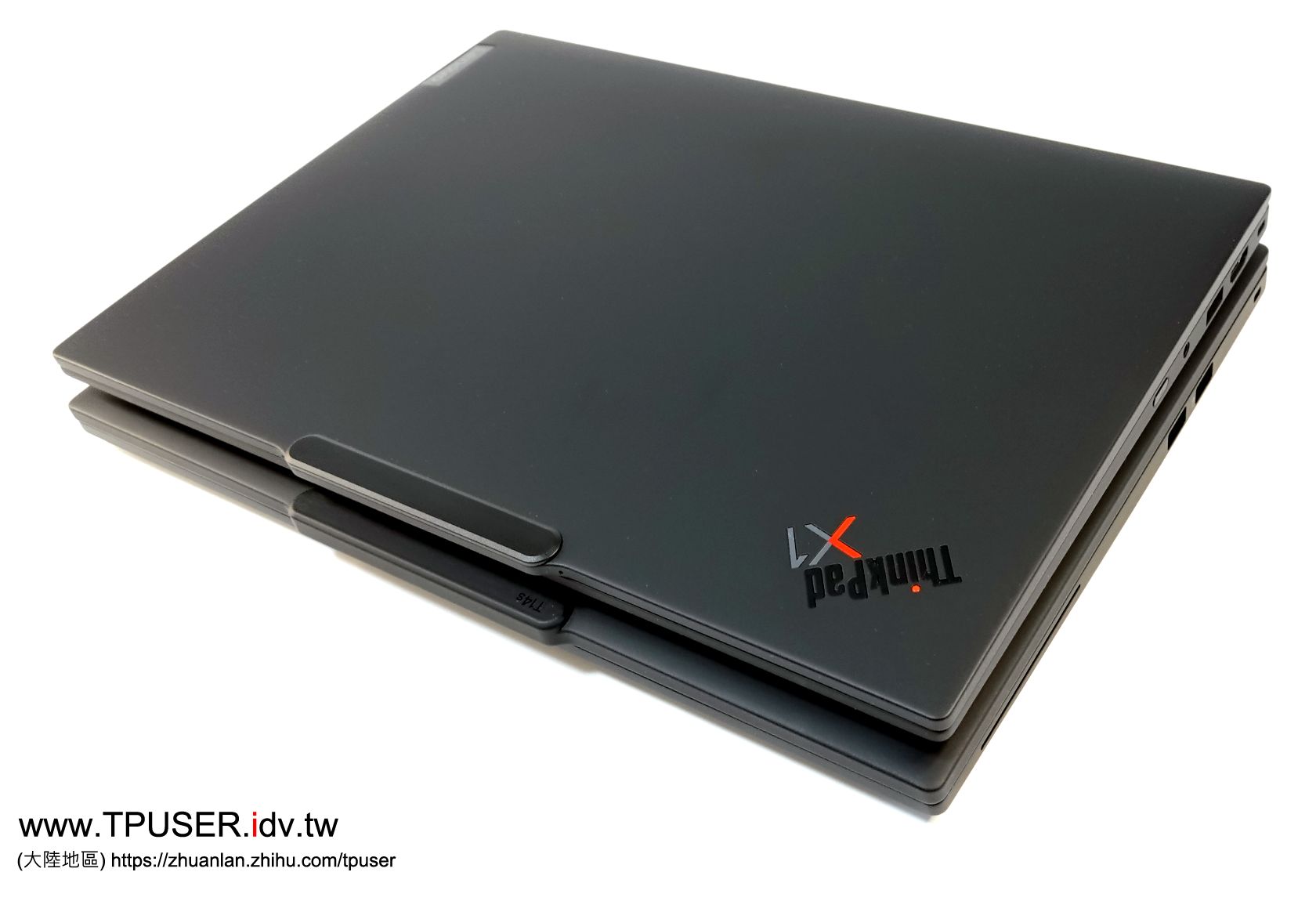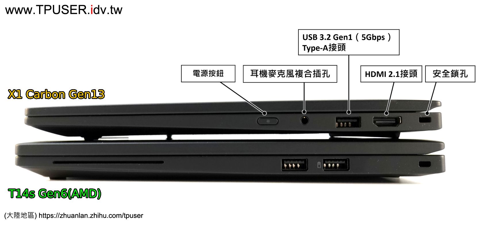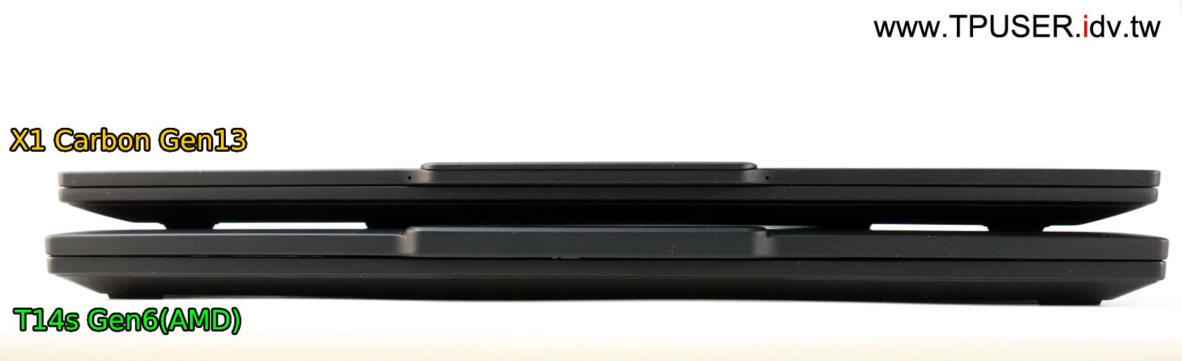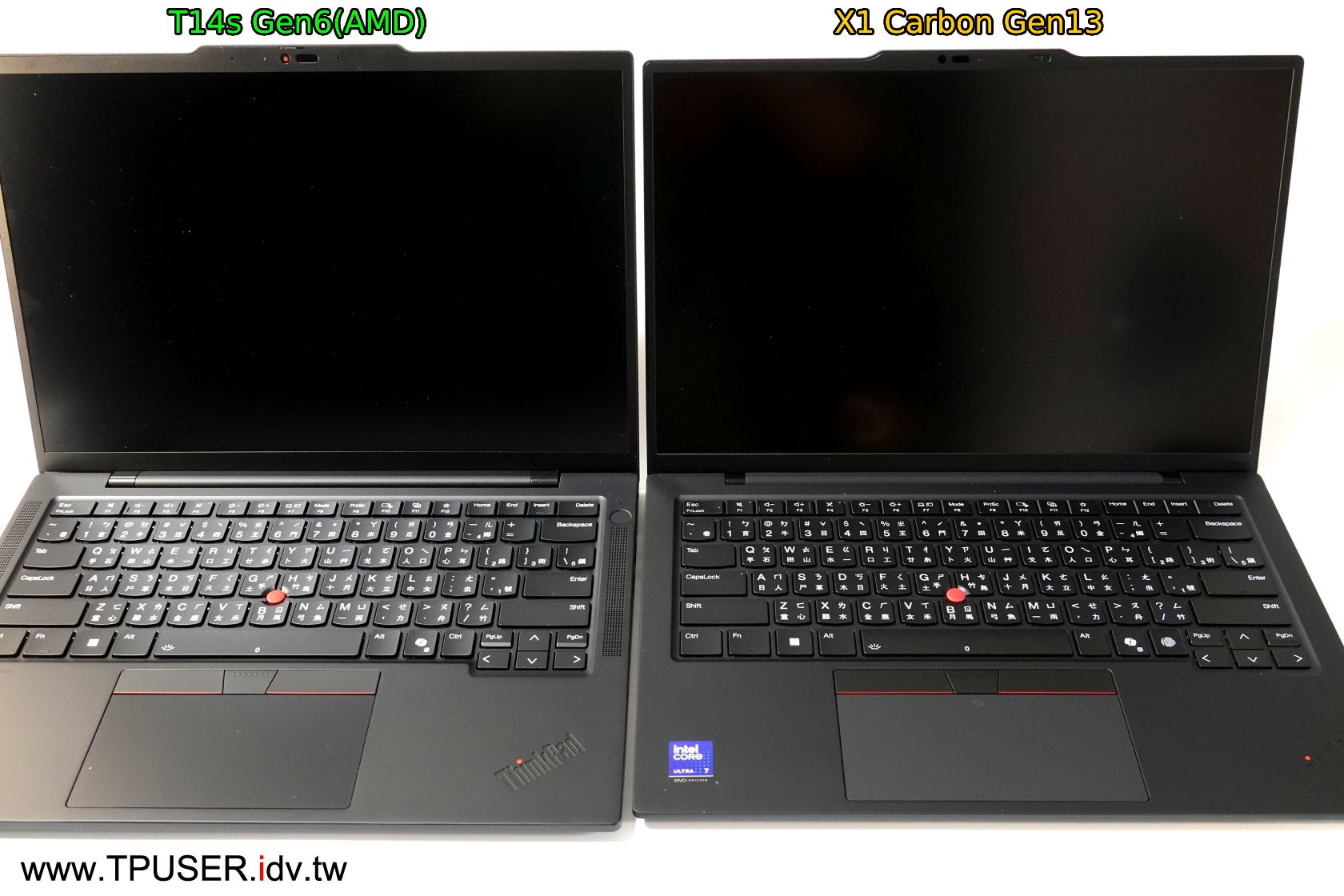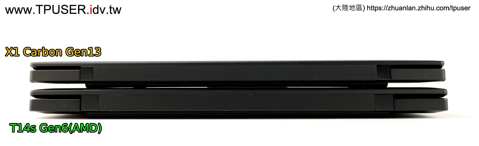 ▼下圖是X1 Carbon Gen13與T14s Gen6(AMD)的對比,兩台都是14吋螢幕,會發現X1 Carbon Gen13還是小台一點,主要差距來自螢幕上方的邊寬長度。