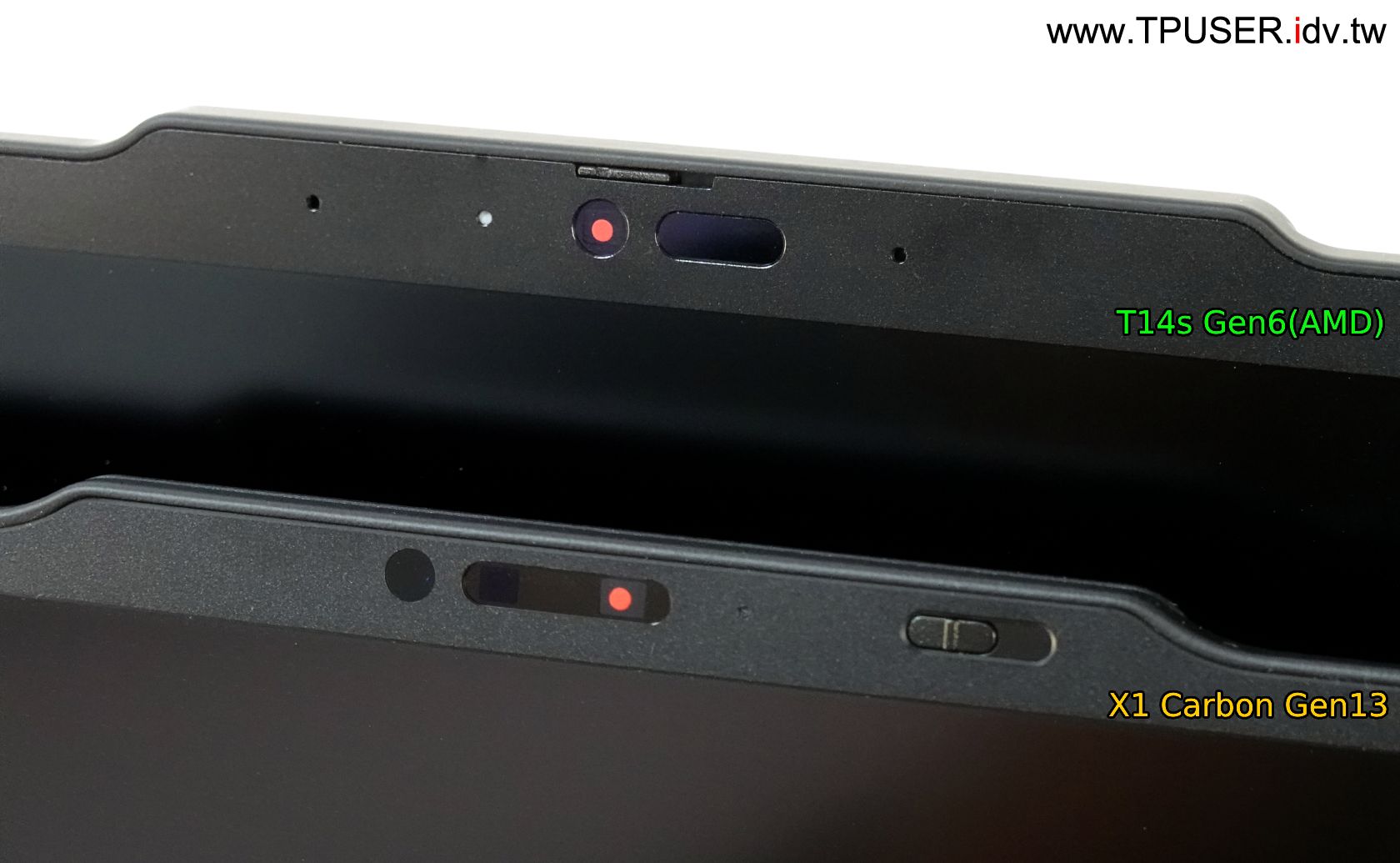 X1 Carbon Gen13的Communication Bar有特別做出金屬拉絲質感,相較之下T14s Gen6(AMD)就沒有特殊處理,但「T14s」機型名稱有印在Communication Bar上面,反而X1 Carbon Gen13仍維持放在螢幕右下角。原本想弄清楚機種型號需要打開螢幕後,查看右下角,或是翻看主機底部,現在導入Communication Bar後,可直接觀察上面印的機種型號。至於X1 Carbon因為在背蓋上有一個大大的「X1」字樣,所以不難識別。