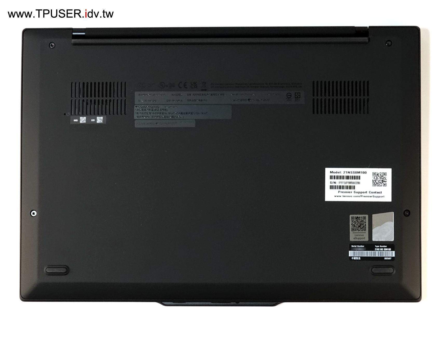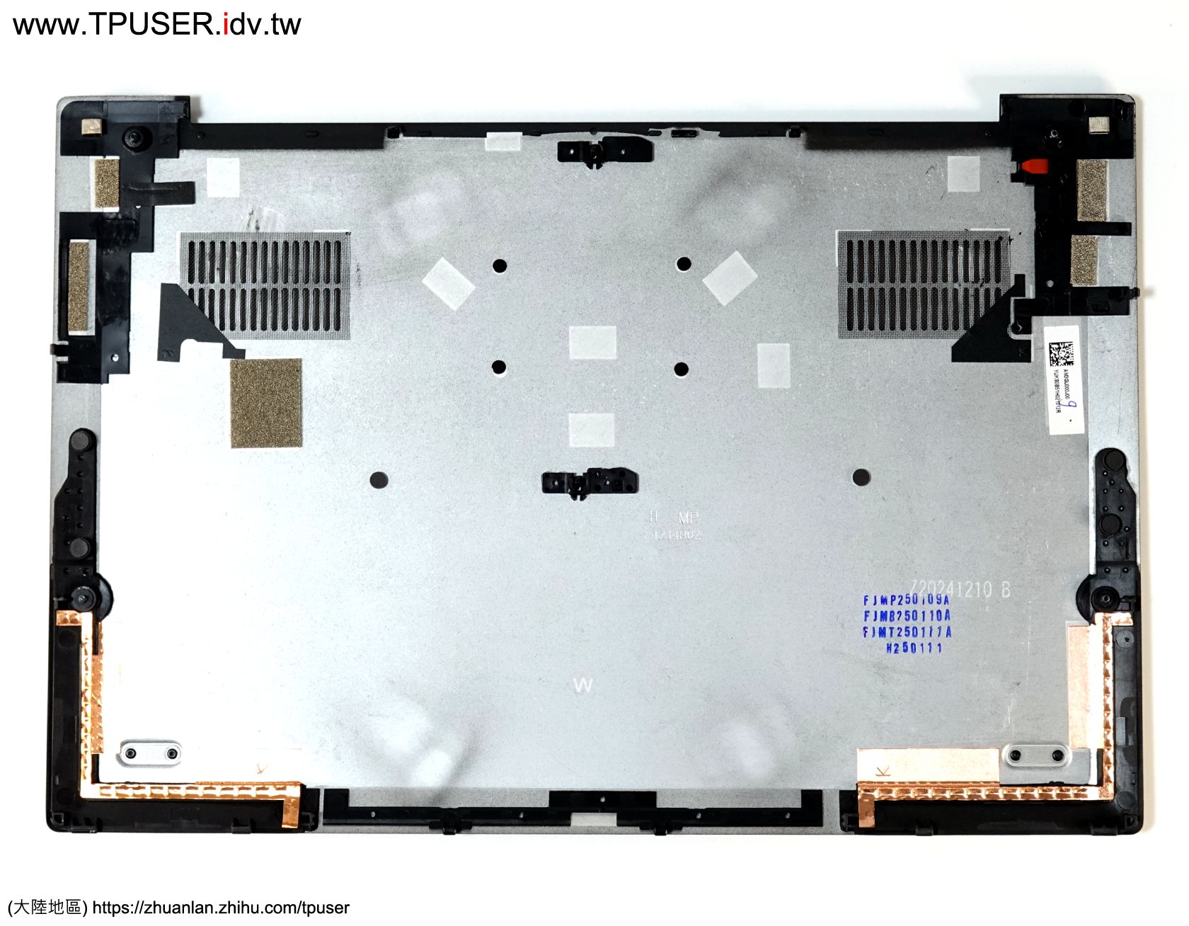 ▼為了讓X1 Carbon Gen13能夠突破一公斤大關,Yamato Lab這次再次請出了祖傳的「鎂合金」底殼。但要留意的是,只有「Wi-Fi Only」機種可以指定採用鎂合金底殼,如果像站長一樣,非得要內建WWAN行動上網功能,此時就只能強制選擇「鋁合金」底殼了。這也是為何站長前後購入了內建5G WWAN功能的X1 Carbon Gen12(Meteor Lake)與X1 Carbon Gen13(Lunar Lake),兩者全裝備的實測重量其實相差不多。Gen12為1177公克,Gen13則為1152公克,兩者只差了25公克。如果要達成原廠宣稱的Gen13最輕重量,就必須捨棄WWAN功能,並指定使用鎂合金底殼、OLD面板,此時官方宣稱的起始重量為986公克。下圖是站長的X1 Carbon Gen13底殼特寫,由於內建5G WWAN功能,所以使用鋁合金材質。