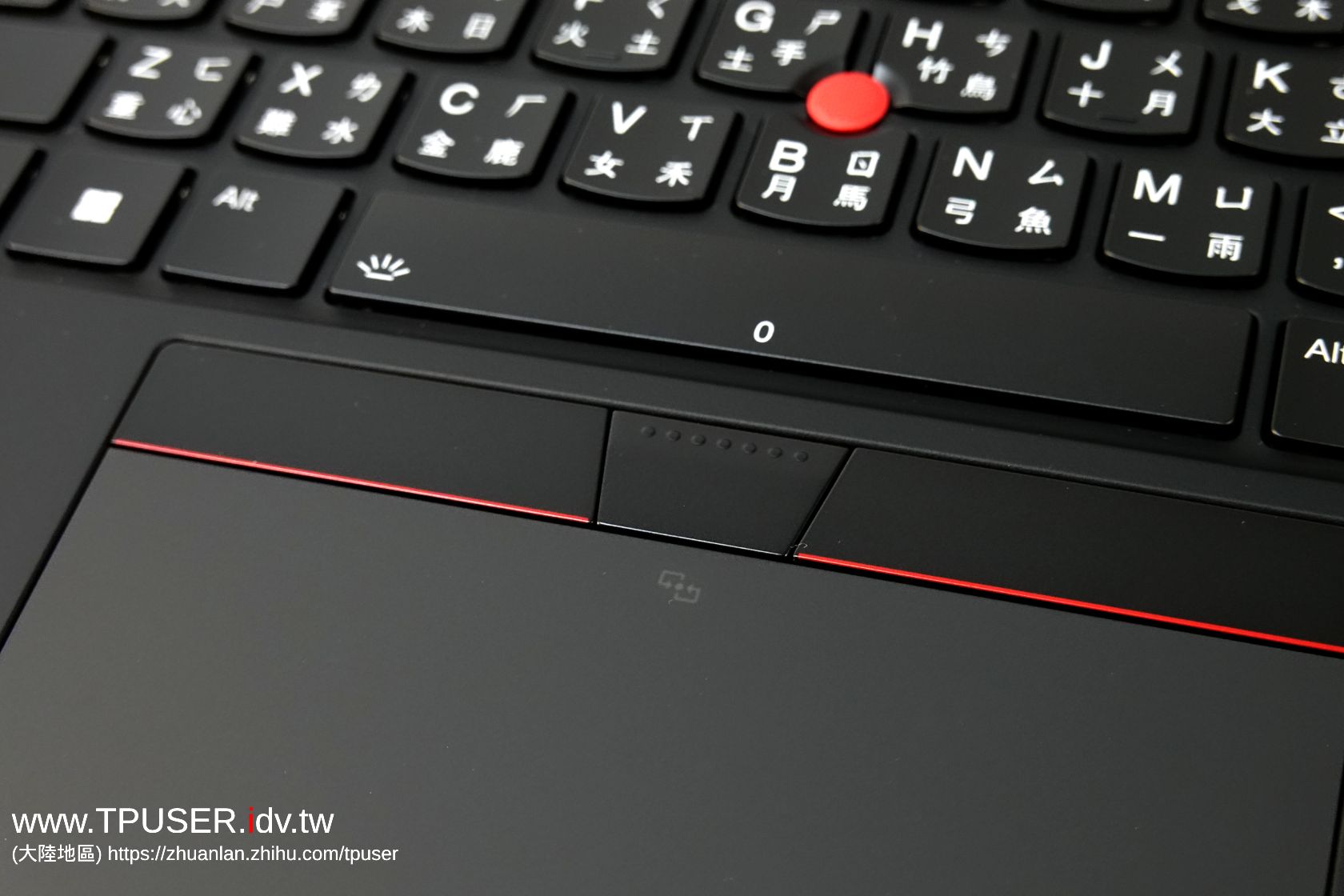 ▼下圖是配備NFC讀卡機功能的TouchPad特寫,象徵NFC功能的圖案標示在上面。X1 Carbon Gen13支援兩種觸控板,一種是支援小紅點實體按鍵的觸控板(ClickPad / TrackPad);第二種則是觸覺觸控板(ForcePad / Haptic TouchPad )。如果選擇觸覺觸控板會有幾項劣勢: