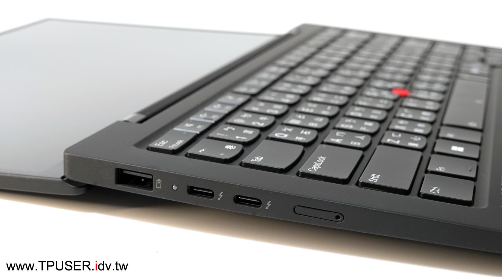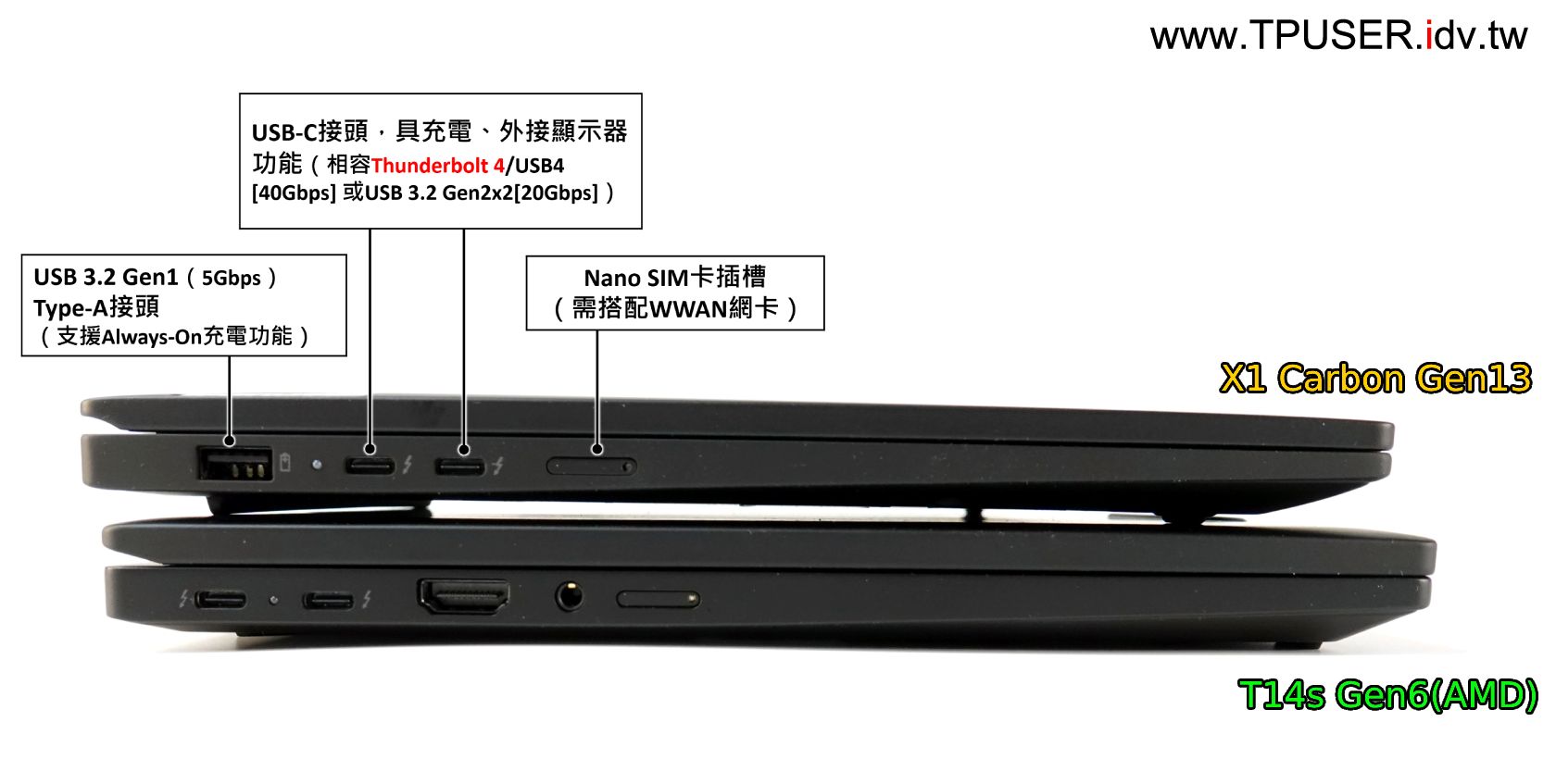 X1 Carbon Gen13跟T14s Gen6都配備完整的「2C + 2A」 (兩個USB-C接頭與兩個USB-A接頭),如下圖所示,T14s Gen6(AMD/Intel)還多了機身右側的Smart Card讀卡機可選配,但T14s Gen6(Qualcomm)版則不提供Smart Card讀卡機功能就是。