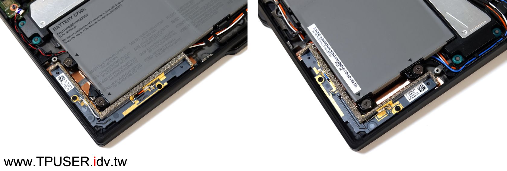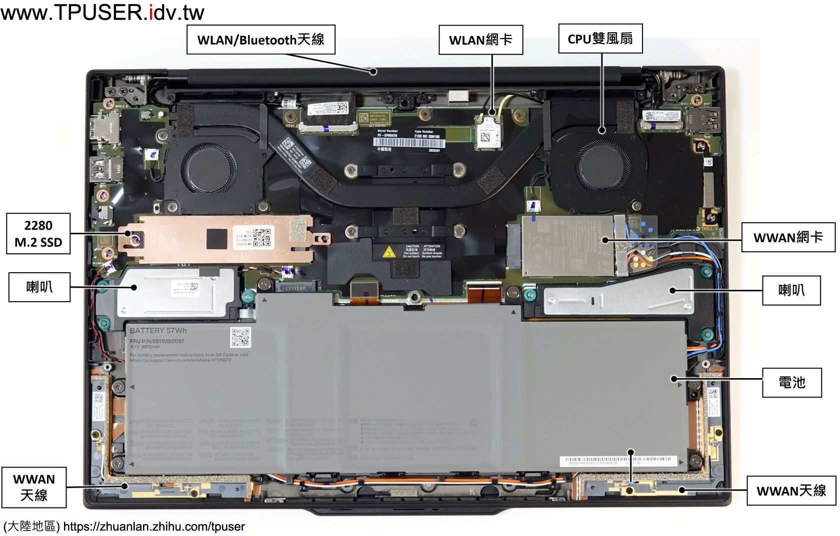 ▼下圖是X1 Carbon Gen13內部特寫,站長已經將主要零件標示出來。由於Gen13與前一代Gen12共用相同的機體設計,所以內部構造幾乎相同。倒是可以從電池顏色來輕鬆分辨兩款機種,因為X1 Carbon Gen13所使用的鋰電池已開放使用者自行更換,也就是所謂的「CRU(Customer Replaceable Unit)」零件,因此電池在面向底殼D cover這面會刻意塗成灰色,主要用意是一旦有外來物(例如螺絲)不慎掉落在上面時,兩者的顏色落差較容易讓使用者留意到。原廠已經開始販售X1 Carbon Gen13的零售版電池(ThinkPad 3-cell 57Wh Li-ion Replacement Battery),產品料號為「4X51U04335」。