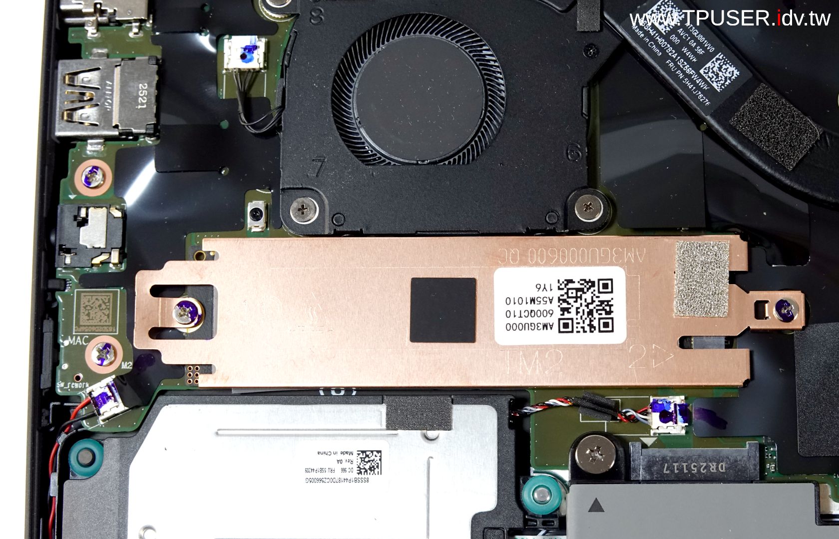 X1 Carbon Gen13仍僅支援單面顆粒的SSD,目前坊間零售的單面版SSD最高容量為4TB,供網友參考一下。下圖為X1 Carbon Gen13的銅製SSD散熱蓋特寫,在此也提醒大家,如果需要自行更換SSD時,不要買內建散熱片的SSD,那些比較適合桌上型電腦使用。