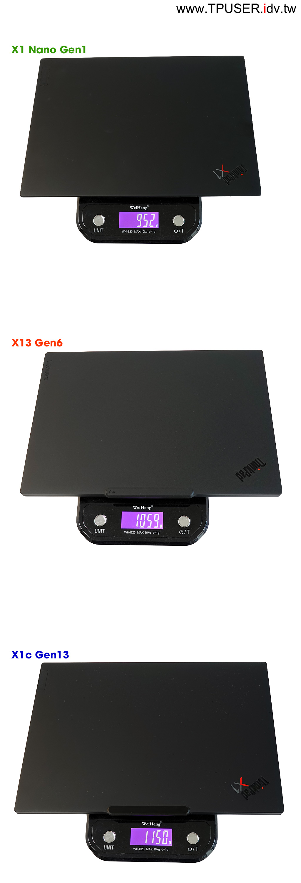 站長自購的X1c Gen13(Lunar Lake)同樣是內建5G WWAN網卡,配備了IPS觸控面板與鋁合金底殼,全機重量為1.15公斤。至於作為對照組的X1 Nano Gen1內建4G WWAN網卡,重量則是僅有952公克,剛好這三台重量從輕到重,都差了90~100公克上下。