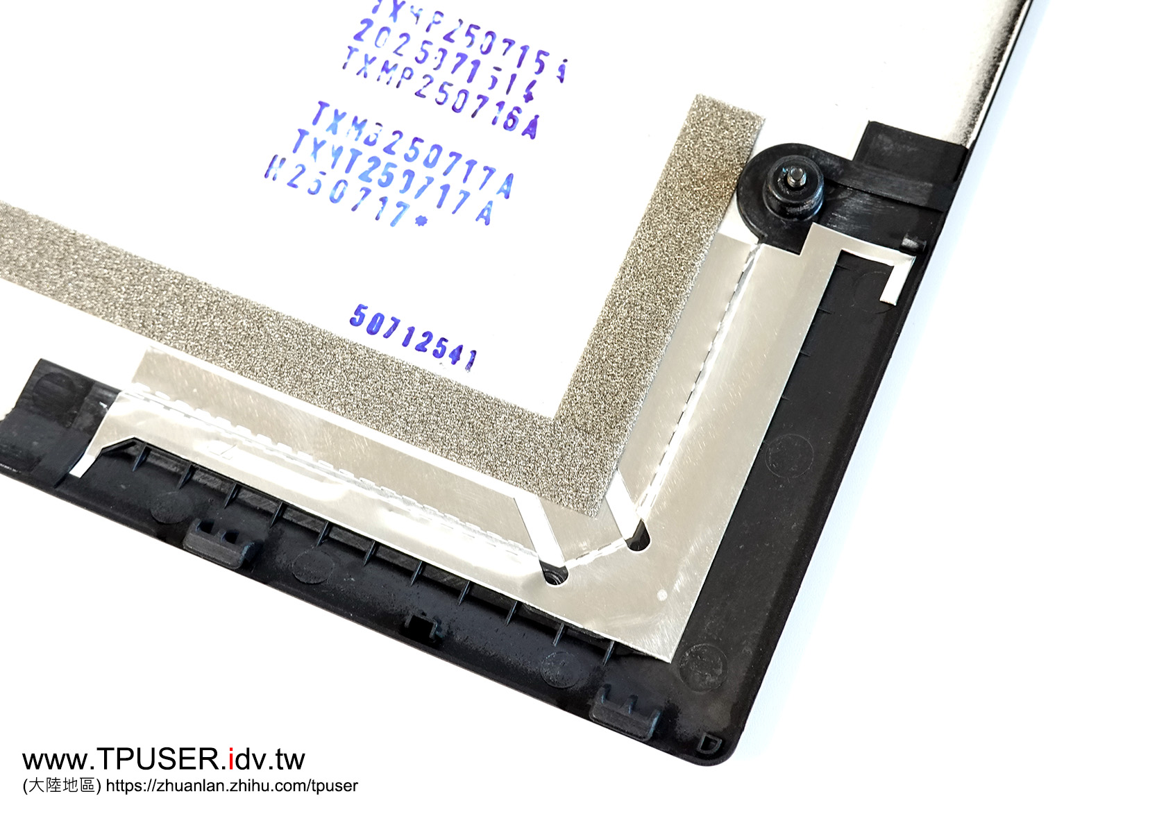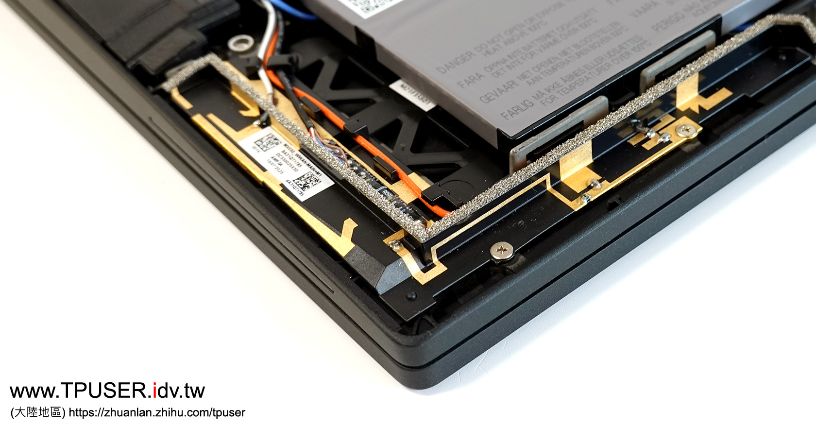 ▼下圖是站長的X13 Gen6底殼內側特寫,站長這台有內建5G WWAN網卡,所以底殼材質為鋁合金,而下圖中黑色的部位就不是金屬材質了,主要用途就是讓5G WWAN無線訊號能從這裡傳送出去,不會被金屬材質所屏蔽,過去原廠稱之為「天線之窗」(Antenna Window)。或許是4G/5G WWAN機種數量較少,原廠就沒有特別再開一個鎂合金材質搭配「天線之窗」的底殼。