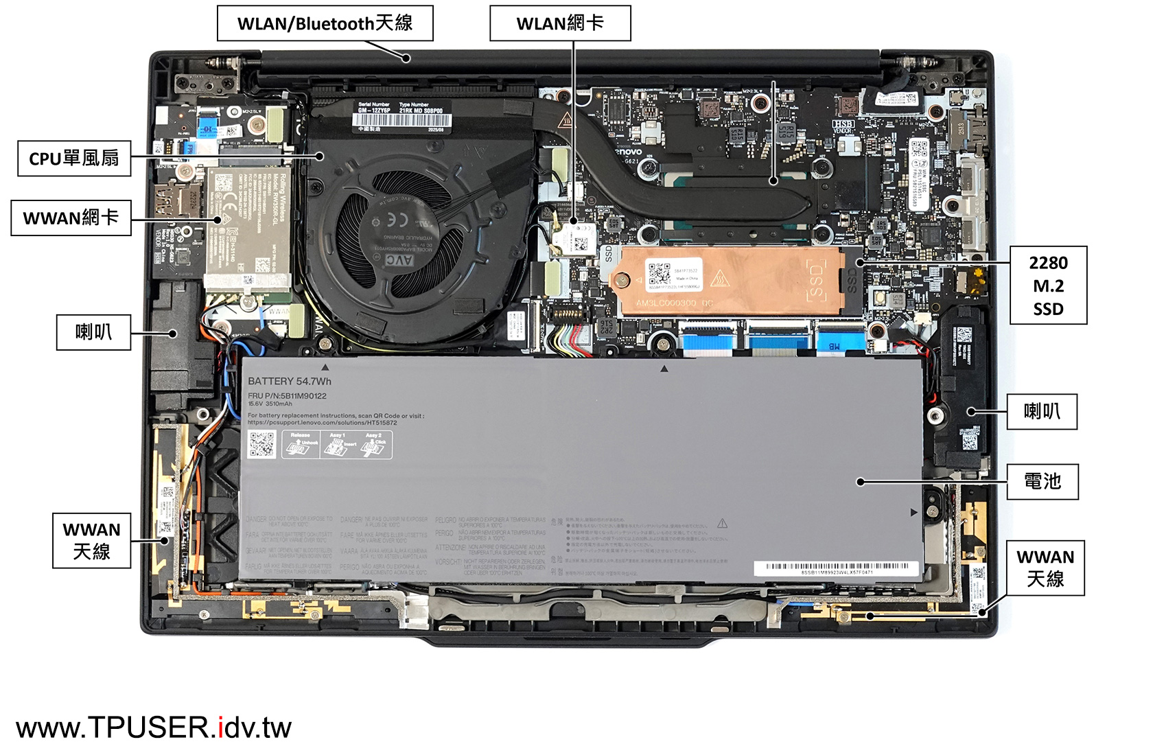 ▼下圖是X13 Gen6的內部特寫,站長已將重要零件都標示出來。從下圖中會發現X13 Gen6內部空間其實已經相當緊湊,而且採用了單風扇設計,甚至連WWAN網卡都是安裝在子卡上,如果是Wi-Fi Only的機種,就會省略WWAN下方的主機板子卡。X13 Gen6與前一代的最大差別除了在CPU與PCIe Gen5 SSD之外,電池也從FRU料號改為開放客戶可自行更換的CRU料號。