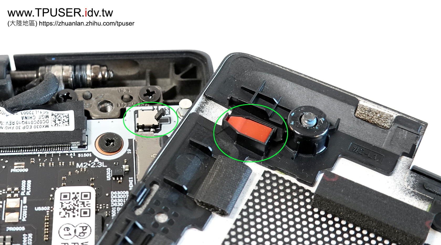 ▼下圖是X13 Gen6主機板上的底殼開啟偵測器,與底殼上的「強固牆」(Rib Wall)特寫。站長在先前幾篇文章都有介紹到這兩裝置的用途,在此就不贅述了。