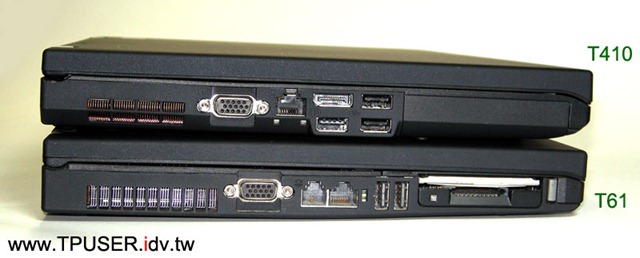 T61與T410的電池槽長度雖然差不多,但T61在電池不突出主機的狀況下僅能容納4-cell電池,T410則可以容納6-cell電池仍維持後方是平整的。T410特別將Modem(RJ11)安排在主機後方,雖然可能的原因是主機兩側都有更常用的連接埠要擺放,但這也讓站長回顧這十年來的T-Series主機元件擺設,其實都與電池槽位置關係密切。在T20/30-Series時代,電池採前置設計,也就是位於Palmrest下方,因此主機後方有足夠的空間容納各種連接埠,特別是當年平行埠、序列埠仍廣為使用,因此也需使用較多的空間來收納,當時Modem便是擺在主機後方。